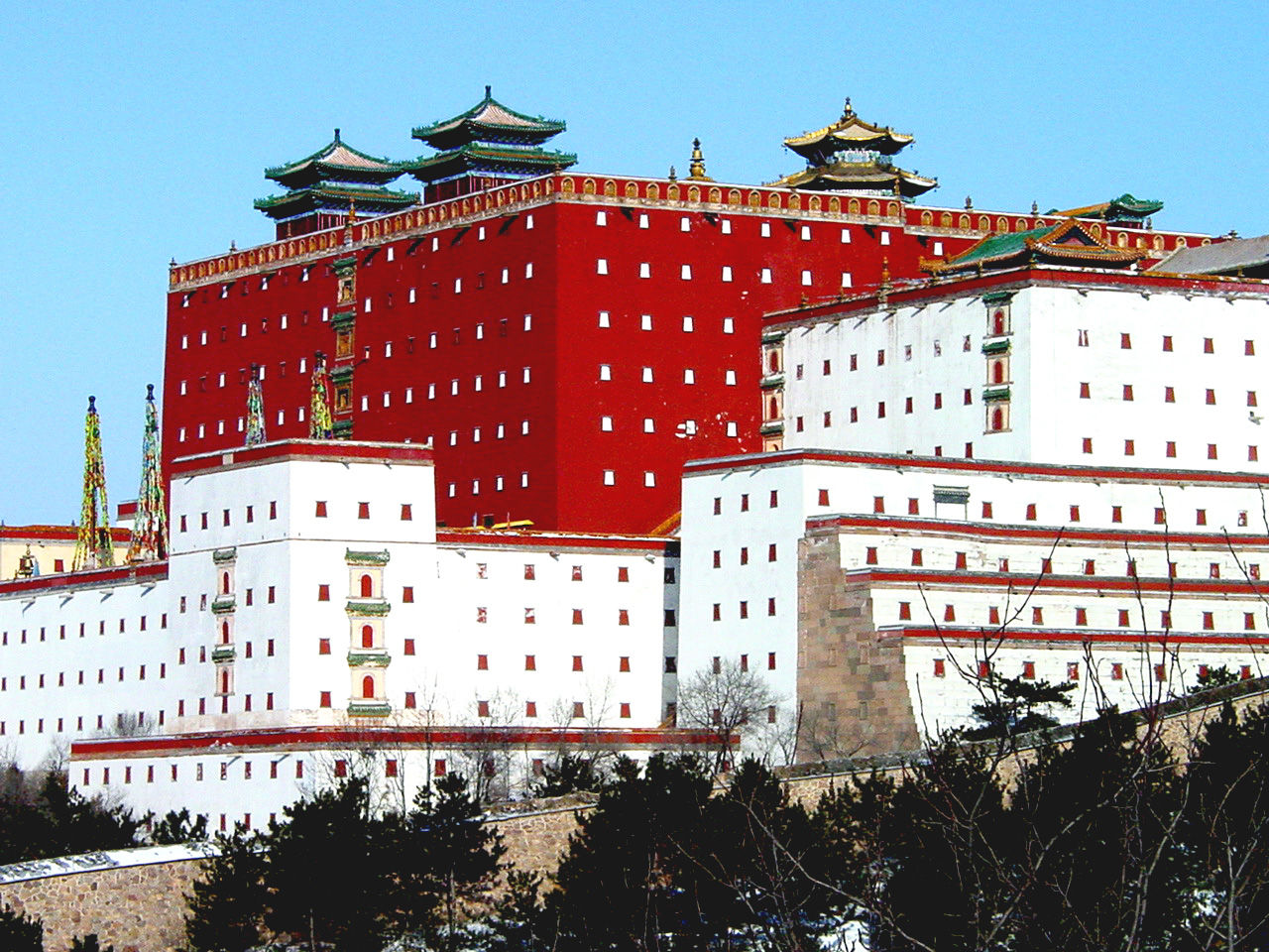 普陀宗乘之廟是仿西藏拉薩布達(dá)拉宮修建的,“普陀宗乘”是藏語“布達(dá)拉”的漢譯。廟依山建造,坐北朝南,山門內(nèi)是碑閣,北是五塔門,版權(quán)所有聊城聊之旅國際旅行社有限公司,轉(zhuǎn)載必究!高十余米,有拱門三個,上建紅、黃、黑、白、綠五座喇嘛塔。門北是琉璃牌坊。牌坊北地形漸高,各式白臺、塔臺建筑因地形而散置,高低有別,變化多端。最后為雄偉高大的主體建筑大紅臺。大紅臺的正面,下面是高達(dá)十八米的大白臺,其上聳立著高達(dá)二十五米的大紅臺。紅臺內(nèi)四周為三層群樓,中央是重檐攢尖鎏金銅瓦項(xiàng)的“萬法歸一”殿。 普陀宗乘之廟布局分三個部分:前部包括山門、碑亭、五塔門;中部包括琉璃牌坊、白臺、僧房等;后部是主體建筑大紅臺及周圍其他建筑,大小共60余處,被包圍在雉堞銜連、依著山勢起伏而環(huán)寺一周的高大圍墻之內(nèi)。