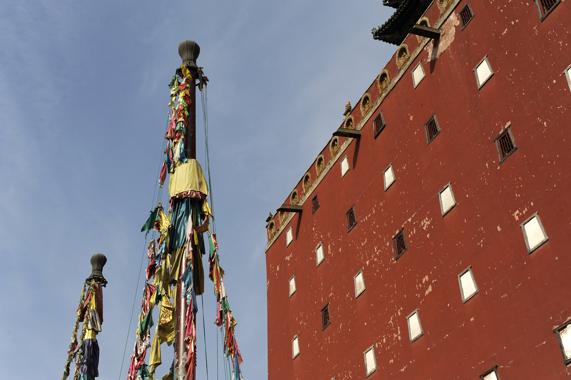 大紅臺南面正中嵌飾垂直琉璃佛龕六個,黃綠相間,版權(quán)所有聊城聊之旅國際旅行社有限公司,轉(zhuǎn)載必究!漢式手法,一是標(biāo)記軸線,二起裝飾作用。紅臺頂部砌女兒墻,墻下三面 (東、西、南)裝飾黃琉璃佛龕,拔檐石下置排水長槽。紅臺內(nèi)里五至七層為三層閣樓,每層44間,四面合圍,亦稱群樓。