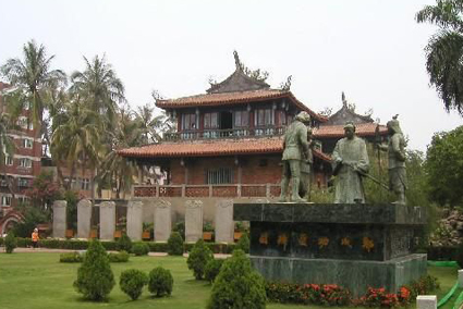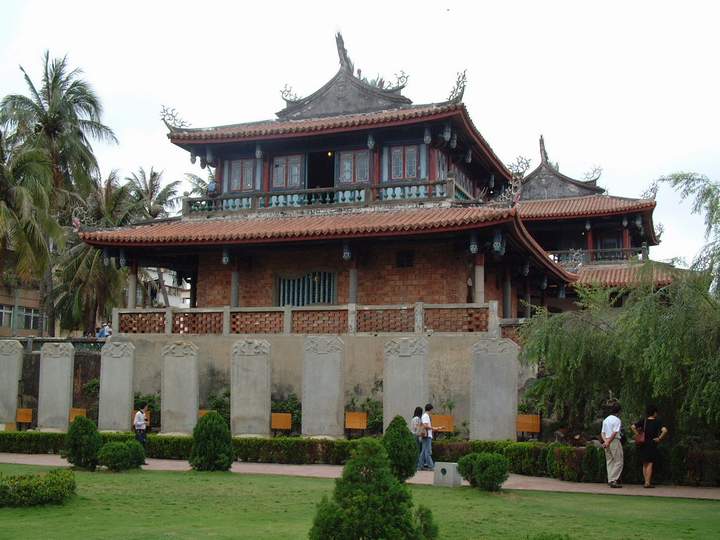 1862年(清同治元年)毀于大地震,光緒年間在廢墟上建文昌閣、海神廟等,即今日的赤嵌樓。樓內(nèi)陳列著荷蘭人投降的條約書,以及鄭成功與荷軍作戰(zhàn)的海圖等珍貴歷史資料。城樓下排列著九座巨大貝屃碑趺的石碑,為乾隆皇帝所賜,上面刻有乾隆親撰的碑文。赤嵌樓的樓上,尚有巨炮及瞭望臺的遺跡。樓前廣場中心建有鄭成功接受荷軍獻降書的雕塑群像。這受降圖是勝利的象征,顯示了中華民族的雄風。