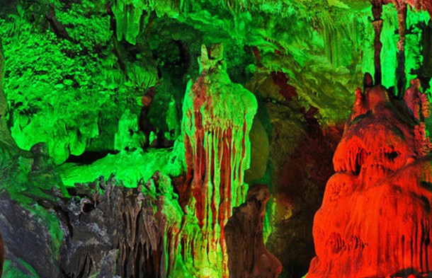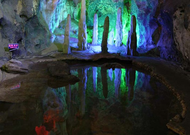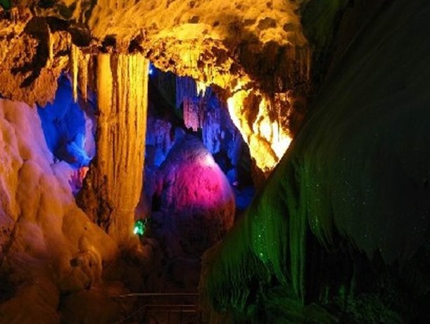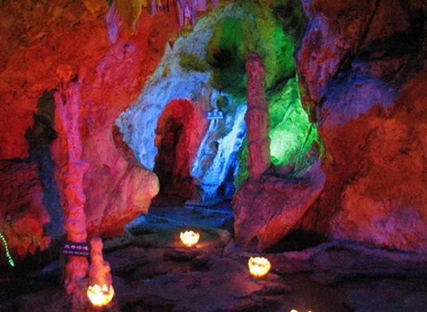 蟠龍洞的特殊景觀有三外:其一是世界三大石花洞之一。洞內石花剔透玲瓏,晶瑩如玉,它附著于巖壁之上,不按重力方向生長,版權所有山東聊城聊之旅國際旅行社有限公司,轉載必究!而向四面節節開花,見氣成石,繼續生長,變幻無窮。其二是我國南方典型的大熊貓--劍齒象動物群"古動物化石區",最為珍貴的是"智人"古人類化石。其三是蟠龍洞尚未開發的龍泉地下河,河中有泉眼,每隔十分鐘左右,泉眼波浪翻滾,似海潮洶涌,沖刷河岸,隨后又似退潮,靜靜地回流石洞,經專家確認為地下間歇泉,是一罕見洞府奇觀。洞長千米,深暗幽邃。里面有高達30米的螺頂,有深不見底的石罅,寬闊空曠處都能容千人,窄處不能2人并行。在洞內跺腳砸壁會發出“嗡嗡”回音,給人一種神秘莫測的感覺。洞口朝南,為券拱門,門上坎刻“龍洞熏風”四個篆字,為康熙14年5月立。洞內10米處,有一供臺,臺上神像已廢,只剩臺下殘存的幾尊羅漢石像身軀。向洞內行至30米處,開始向右下方拐彎,回頭外望,只見洞口猶如月牙出山,人稱“回首望月”。繼續前行,步步廳景。鐘乳石形成的“火燒葡萄架”含珠點翠;石壁上被浸蝕成的“仙人炕”形體逼真;巨石橫貫的“仙人橋”奇特驚險,世間罕見。再向里進,八戒可見鐘乳石形成的“江豬探海”、“水簾瀑布”、以及多年沖刷而成的“姜池”、“藕池”,池內形似鮮姜的鐘乳石如霞似錦。“蓮藕”如雪似玉。“玉龍騰空”尤惹人注目:在高達20米的洞壁上,有一塊鐘乳石,宛若玉龍,通體覆蓋著銀光閃爍的“龍鱗”,妙不可言;龍頭垂下,嘴里噴球吐玉人,人稱“龍滴水”,滴在下面“蓮花盆”里,四時不涸。“鷂子翻身”是洞內向下延伸的地方,此處游人不能正面行進,必須翻過身子,雙手攀石倒行;路旁有深不見底的石罅。走過險境,是一段空闊平坦的地帶,版權所有山東聊城聊之旅國際旅行社有限公司,轉載必究!這兒路面干燥,清風習習。再向里前進,便是“倒爬四十步”,雖然路程難走,卻另有一番意境。再向前行200米,有巨石擋堵,不能前往。洞口外200米處為金代佛隱寺遺址,存戲臺和石碑1通、古柏1株。漫山蒼松翠柏,郁郁蔥蔥;山下溝壑幽深,樹林茂密。