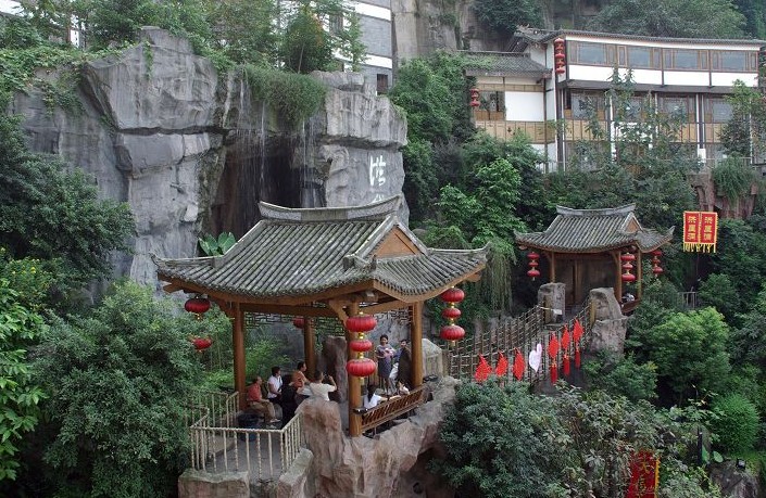 在古鎮磁器口最有特色的一景是茶館。昔日在這千年古鎮,隨處可見茶館。當年的水手、袍哥大爺、閑雜人等都喜愛出入此間,版權所有山東聊城聊之旅國際旅行社有限公司,轉載必究!茶館成了龍蛇混雜之地。在陪都期間,這一個小鎮茶館達100多個。其特色是“書場茶館”,又稱藝人茶館,是品茗欣賞民間藝術的地方。書場茶館戲曲品種不少:有川劇坐唱(打圍鼓)、四川清音、四川竹琴(揚琴)、荷葉清唱更普遍是說書茶館。坐茶館的人絡繹不絕,座無虛席。賣報的報童:‘賣報,賣報”的喊聲不絕于耳。姑娘和大嫂們:“賣瓜子,南瓜子,葵瓜子,賣花生,磁器口的鹽花生!”叫賣聲清脆響亮。特別是晚上能在茶館登臺說書的人,都是上品的高手,所以人們稱之為“品仙臺”,都是掛牌說書,看誰有絕技高招,誰能爭取更多的茶客,誰就能得到“紅包”。哪一位說書人講得好、茶館的生意必定會更加興隆、老板自然高興,說書人得的紅包就越厚實。直到如今,茶館仍是磁器口一景,百來米長的老街便有13家茶館,家家茶客滿座,古風猶存。名特小吃毛血旺、軟燴千張、椒鹽花生被譽為磁器口的“三寶”。