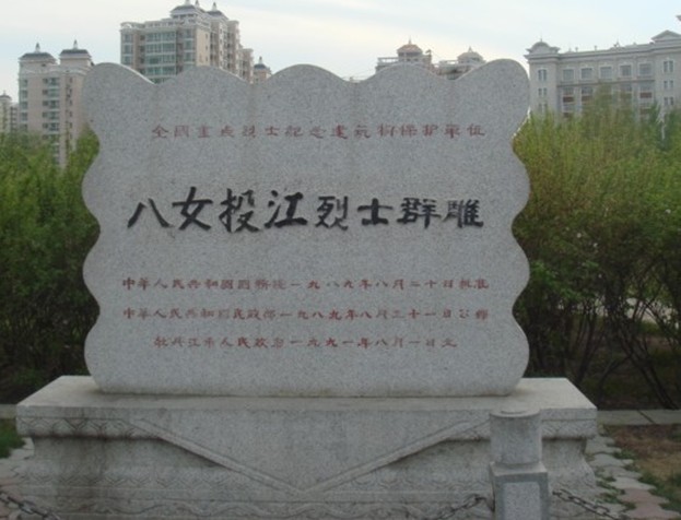 八女投江紀念地位于牡丹江畔的江濱公園。該群雕1988年落成,高13米,長8.8米采用花崗巖石材雕鑿而成,"八女投江"四個大字由全國政協主席鄧穎超生前書寫。站在這碩大的群雕前,無不使人思維翻滾,心潮澎湃,當年八女視死如歸,英勇戰斗的情景又呈現在人們的面前,1938年10月下旬,東北抗聯四、五軍西征婦女團,在指導員冷云帶領下,擔負著掩護大部隊轉移的任務,她們英勇抗擊日軍熊谷部隊的襲擊。