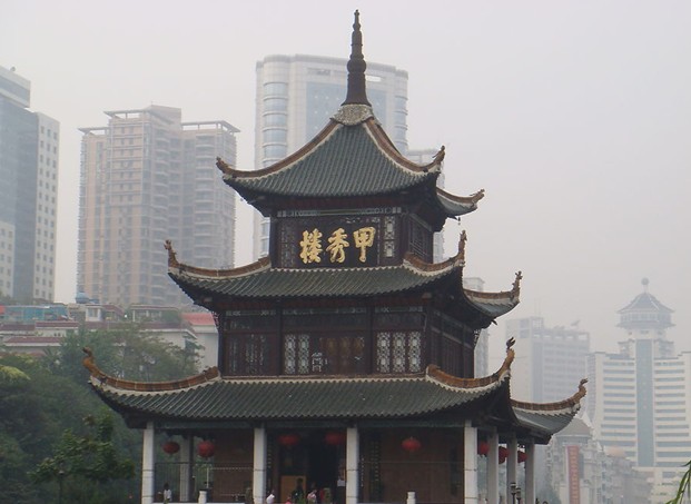 甲秀樓在貴陽市城南的南明河上,以河中一塊巨石為基而建。始建于明,后樓毀重建,改名“來鳳閣”。清代甲秀樓多次重修,并恢復原名。現存建筑是宣統元年(1909年)重建的。樓上下三層,白石為欄,層層收進,由橋面至樓頂高約20米。南明河從樓前流過,匯為涵碧潭。樓側由石拱“浮玉橋”連接兩岸,橋上原有小亭一座叫“涵碧亭”,現已拆除。甲秀樓朱梁碧瓦,四周水光山色,名實相符,堪稱甲秀。