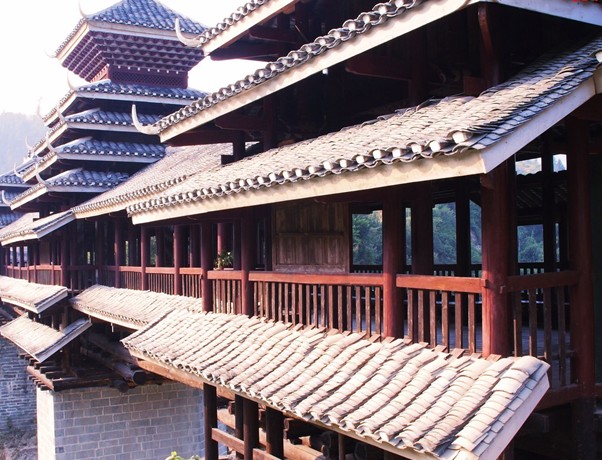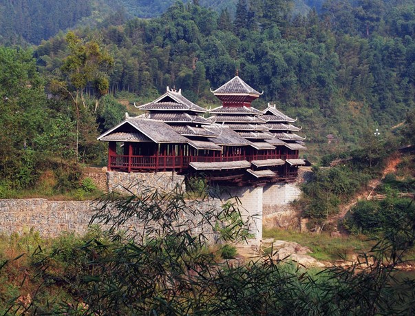 地坪風(fēng)雨樓 這是貴州省最大、造型最美的風(fēng)雨橋。長(zhǎng)達(dá)50多米的地坪風(fēng)雨橋始建于清光緒二十年即公元1894年,1959年毀于火災(zāi),1964年重建。整座橋不用一釘一鉚,而運(yùn)用杠桿力學(xué)原理,將大小不一的柱、枋、檁、凳、欄桿等全部用杉木鑿榫穿枋構(gòu)成。橋體為長(zhǎng)廊式木結(jié)構(gòu),橋上有一大兩小共三座橋樓。居中的大橋樓是鼓樓式建筑,兩邊的橋樓皆為三層重檐雙斜面屋頂。