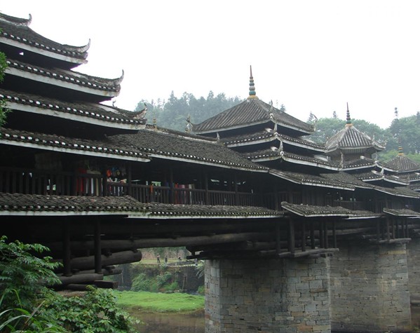 地坪坪風雨橋又名花橋,始建于清光緒二十年(1894年)。橋總長70米,高出水面8米,寬4.5米,河中立一青石石墩。橋為木質結構,橋的下部由兩排各為8根粗大杉木穿榫連成一體,分兩層呈天平狀向邊懸掛。每層挑出約兩米。橋廊兩側有一米高的梳齒欄桿。欄桿外面又有一層外桃1.4米的挑檐。橋廊內兩側下面設置連通板凳供人歇憩。 看地坪風雨橋真正要看的是它的裝飾。地坪風雨橋上部為花板,繪有各種侗族風慶人物故事山水、花木、動物等彩畫。此外,“樓葉,樓”四柱繪有4條青龍抱柱,版權所有山東聊城聊之旅國際旅行社有限公司,轉載必究!頂層花板又繪有龍虎鶴牛齊歡圖案。橋兩頭柱壁上畫了三幅楹聯。 另外在北面的平地上配建有——座風雨主亭,高約9米,為6角攢尖頂,同樣具有濃厚的民族特色.