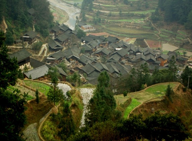 郎德上寨四面群山環繞,村前是一條清澈見底的溪流,流入美麗的丹江。跨溪有風雨木橋,沿溪有石磨碾房,水中群鴨嬉戲,兩岸水車成行。寨子對面有養流坡,坡腰有8畝許平地和一長150米的賽馬跑道。每年農歷三月馬日,雷山、凱里、麻江、丹寨四縣交界的苗族男女青年,在此舉行爬坡活動,對歌,賽馬,盛極時達萬余人。郎德上寨民居依山而筑,為木質結構吊腳樓。有五條花街路通向寨中。東、西、北面置有木柱瓦頂護寨門樓,簡稱“寨門”。寨上,吊腳木樓,鱗次櫛比,錯落有致。版權所有山東聊城聊之旅國際旅行社有限公司,轉載必究!寨中道路、院壩及各戶門庭,都用鵝卵石或青石鑲砌鋪就。寨中有兩個銅鼓、蘆笙場。場子模仿古代銅鼓面太陽紋的圖案,以青褐色鵝卵石和料石鋪砌成十二道光芒,朝著十二個方向伸展。銅鼓、蘆笙場的兩頭,用鵝卵石、水泥鑲嵌成兩匹飛奔的駿馬。