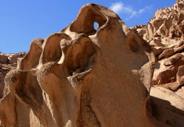 怪石山距巴里坤縣城60公里,有10多公里的便道與縣城至煤礦的柏油公路相接,位于巴里坤湖西北7公里外小夾山的最東端。怪石山最怪的就是滿山的形狀各異的小石窟,幾座山從山頂到山腳都是“千瘡百孔”,有的稱“蜂窩崖”,有的稱“千佛洞”或“萬佛龕”、“千窟崖”等。每當下暴雨時水從山頂流下,那山便成了無數個小水簾洞,景致令人叫絕!怪石山下就有一眼泉水,是著名的巴里坤八景之一——“鏡泉宿月”的上鏡兒泉所在。