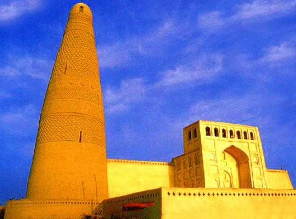 與寺緊挨著的蘇公塔,整個磚砌,由臺上量起高44米,頂上為圓形,直徑2.8米,下徑擴大甚多,為11米。塔下為高臺,版權(quán)所有山東聊城聊之旅國際旅行社有限公司,轉(zhuǎn)載必究!高臺旁邊是公路,公路又低于高臺約10余米,所以在寺外仰視,高塔凌云。同時塔身上又滿布花紋,如纓絡(luò)、錦繡等。只此一塔,便使古城增添了無限的生氣。塔形渾圓,全部磚砌,中有螺旋形賠道,盤旋直達塔頂。這樣壯麗奇?zhèn)サ拇蟠u塔,其砌造技藝是我國清真寺建筑中一項偉大貢獻,也是勤勞的維吾爾族人民表現(xiàn)在建筑技藝上的一大成功。