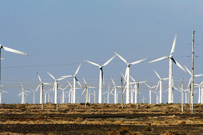 在烏魯木齊去吐魯番的途中,沿路南行,在通往絲路重鎮達坂城的道路兩旁,上百臺風力發電機擎天而立、迎風飛旋,與藍天、白云相襯,在博格達峰清奇峻秀的背景下,在廣袤的曠野之上,形成了一個蔚為壯觀的風車大世界。這里就是目前我國最大的風能基地——新疆達坂城風力發電廠。