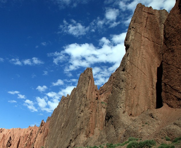 維吾爾語“克孜利亞”是“紅色的山崖”之意。神秘的“天山大峽谷”是天山支脈克孜利亞山中的一條峽谷,紅褐色巖石經過大自然億萬年的風刻雨蝕之下,才形成由現在“天山大峽谷”。“天山大峽谷”紅褐色的山體群直插云天,在陽光照射下,猶如一簇簇燃燒的火焰。“天山大峽谷”的迷人之處,不僅僅在于它的雄奇、險峻,而在于它的幽深、寧靜和神秘。站在谷底仰視高山,只覺得陡峭的峰巒似乎隨時隨刻都會壓下來,令人感到窒息、眩暈。
