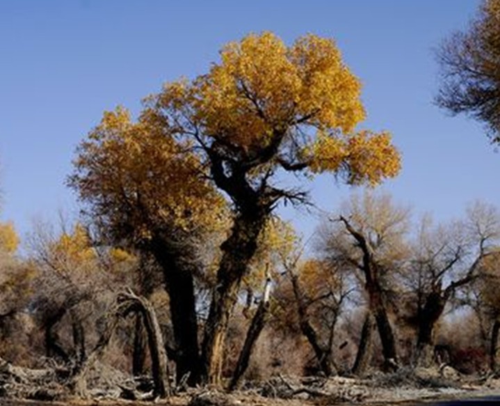 胡楊是第三紀(jì)殘余的古老樹種。胡楊生長期漫長,由于風(fēng)沙和干旱的影響,很多胡楊樹造型奇特、詭異,有“活三千年不死,死三千年不倒,倒三千年不朽”的說法。全世界的胡楊絕大部分生長在中國,而中國百分之九十以上的胡楊林又生長在新疆塔里木河流域。 胡楊,維吾爾語叫“托克拉克”,意為“最美麗的樹”。由于它頑強(qiáng)的生命力,以及驚人的抗干旱、御風(fēng)沙、耐鹽堿的能力,人們又叫它“沙漠英雄樹”。胡楊,還有紅柳、梭梭、沙棗等沙漠植物,它們的一生是一部啟示錄——有關(guān)生命與死亡、大漠首位與絕處逢生的啟示錄。