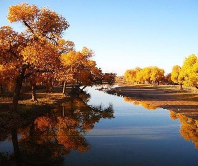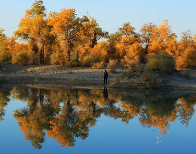 曠野上隨處可見輪臺油田高聳藍(lán)天的井架、排列齊整的鉆機(jī)和車隊以及井口噴射的朵朵烈焰,使昔日覺寂的荒原,充滿活力和生機(jī)。該公園現(xiàn)建有木頭賓館、磚砌的四合院接待站和食堂,可解決旅客的食宿。公園接待站后院高聳著一座二三十米高的了望鐵塔,登上塔頂,但見蔚藍(lán)的塔里木河蜿蜒曲折,散成眾多的汊流,汊流間布滿胡楊林。胡楊林海,順著塔里木河一直伸向茫茫天際,好不壯觀!森林公園色彩絢麗多變,綠樹、碧水、藍(lán)天,猶如一幅濃重的水墨畫。秋初黃綠相間,深秋一片金黃。公園中建有水榭、湖心亭,備有游船、汽艇可供開展巡河觀光。這里的河汊全長7千米,開始段呈長圓開如湖蕩,水中建有湖心亭,各種水鳥珍禽集隊飛翔鳴啼在湖面和森林中,湖中樹木倒影清晰,環(huán)境靜謐,空氣清新,漫步湖濱,令人心曠神怡;河汊中間段水面寬闊,汪洋一片,水波蕩漾,水中到處布滿奇開怪狀的枯樹與樹樁,船行其間猶如穿梭在梁山泊的水寨間,別有情趣,河汊末端水道收縮變窄,形成條條港汊,水流紋絲不動,水平如鏡,河汊兩邊的胡楊林連同藍(lán)天白云倒映水中,其影像比明鏡中的影子還要清晰逼真,令游人叫絕;河汊末端是蘆葦蕩和胡楊紅柳沙丘群,潔白的葦花蕩和胡楊紅柳沙丘群,潔白的葦花在逆光透射下發(fā)出誘人的銀白色光芒;牛、羊群悠閑地覓食在紅柳沙包中。登上沙丘頂,向南望,胡楊林一眼望不到邊;向北遠(yuǎn)眺,沙漠油井噴射的火焰映紅了藍(lán)天。這如詩如畫的美景迷倒了無數(shù)的游人,令人流連忘返,特別是那些攝影愛好者和畫家,在這里一住就是一周甚至半月。