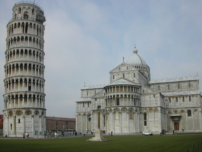 比薩斜塔(意大利語:Torre pendente di Pisa或Torre di Pisa)是意大利比薩城大教堂的獨立式鐘樓,于意大利托斯卡納省比薩城北面的奇跡廣場上。廣場的大片草坪上散布著一組宗教建筑,它們是大教堂(建造于1063年—13世紀)、洗禮堂(建造于1153年—14世紀)、鐘樓(即比薩斜塔)和墓園(建造于1174年),它們的外墻面均為乳白色大理石砌成,各自相對獨立但又形成統一羅馬式建筑風格。