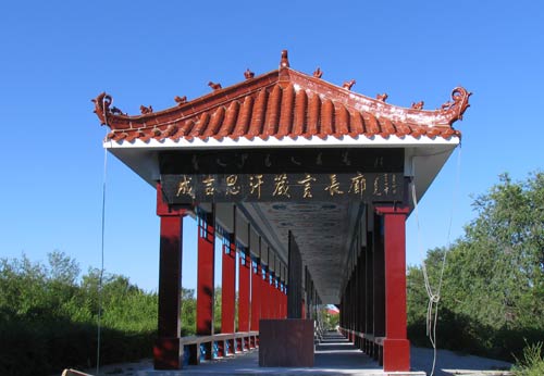 長廊里豎立幾十塊刻有成吉思汗箴言的大理石石碑,碑文內容為蒙漢文對照,書法字體多種。有“知自己之弊病問他人,而知之治國之失誤向賢者而學之。”,“不要以金銀珠寶裝飾自身,而要以道德才能充實自己。”,“能治家者即能治國,能率領十人作戰者可以委付以千人萬人,他就率領千人萬人作戰。”,“只要你們兄弟互相幫助,彼此堅決支援,你們的敵人再強大也戰不勝你們。”,“生為金玉之身不為學而治己者,乃枉費一生也;人雖聰明睿智其知識終有枯竭之時,如能勤學不輟尤為聰明。”,“讀書的糊涂人終究要超過生來的聰明人”,“居民在平時應像牛犢般的馴順,戰時投入戰斗應像撲向野禽的餓鷹。”,“疾恨他人發家反而沖了自家的財神”,“說萬句空話莫如辦一件正事”等等。