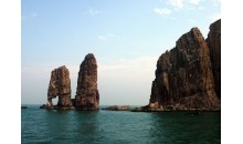 高山島,屹立于廟島群島中部西側(cè),隸屬砣磯鎮(zhèn)。這個(gè)面積僅有0.46公里的無居民小島,在諸島排列中列第12位。它集海蝕崖、海蝕洞、海蝕柱、海蝕礁、海蝕階地和海積卵石灘于一身;納高雄、險(xiǎn)峻、幽深、粗獷靈秀于一隅。它裸露著胸懷,放蕩無拘地把海島的地質(zhì)遺跡向世人全方位的展示,可謂長島地區(qū)地質(zhì)遺跡的“天然地質(zhì)公園”。