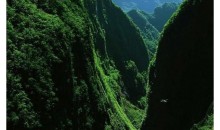 百漈溝因溝內大小瀑布水簾百條之多得名。又因水急溝深直瀉成白色別名白漈溝,水瀉形態土話稱漈,書上稱瀑。百漈溝遠觀為山凹,近眺為峽谷,遠看水成漈,近睹瀑九級。方圓5公里,景點沿著一條1000多米長的峽谷循序漸進,分別由百祭湖溪休閑區、水簾瀑布區、天坑峽谷休閑區、天坑彩虹瀑布區、人參瀑布觀景區、白龍坑觀賞區六大景區組成。