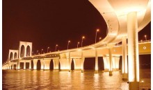 西灣大橋是連接澳門半島和氹仔島的第三座大橋,于2002年10月8日動(dòng)工興建,主橋于2004年6月28日合龍。西灣大橋北起澳門半島融和門,南至氹仔碼頭,采用“豎琴斜拉式”設(shè)計(jì),兩個(gè)主橋躉之間跨度達(dá)180米。該橋總長2200米,分上下兩層:上層為雙向6車道,下層箱式結(jié)構(gòu),雙向4車道行車,可以在8級臺(tái)風(fēng)時(shí)保證正常交通,橋內(nèi)還預(yù)留了鋪設(shè)輕型鐵軌的空間。